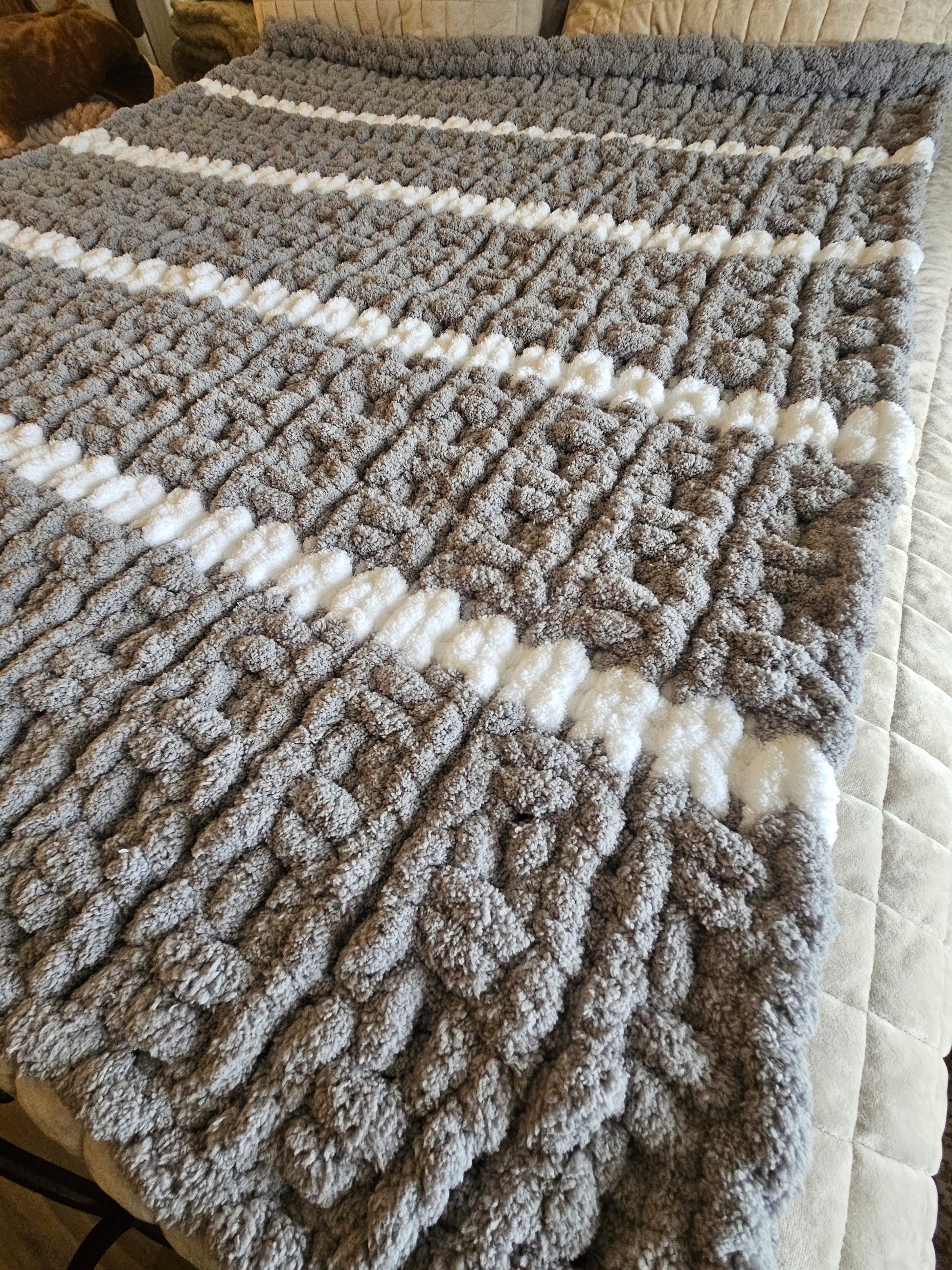 Elevate your home decor with this stunning, hand-knitted chunky throw blanket. Meticulously handcrafted by Kimberly at Cottage Craft, this piece combines modern style with unbeatable warmth.