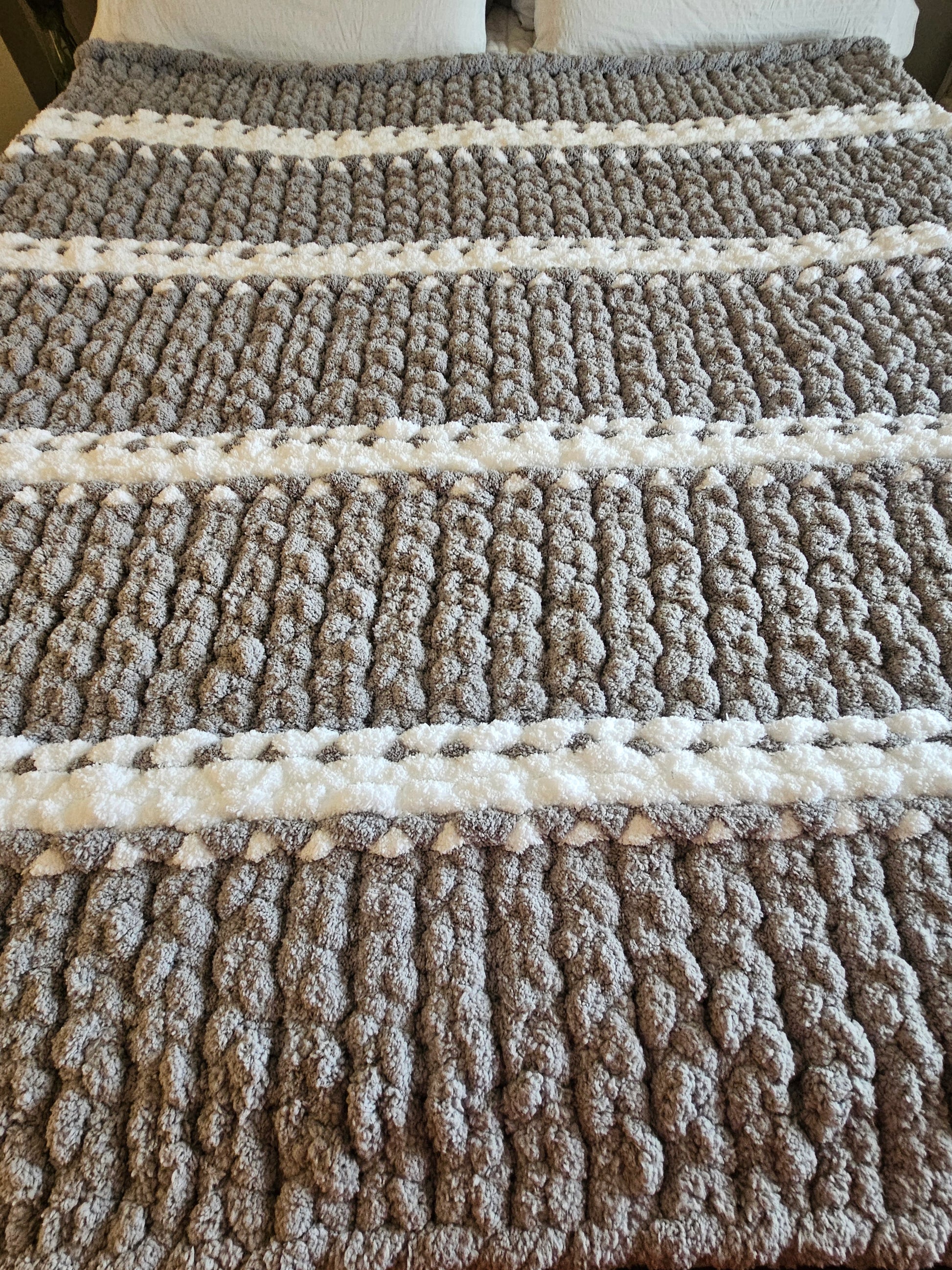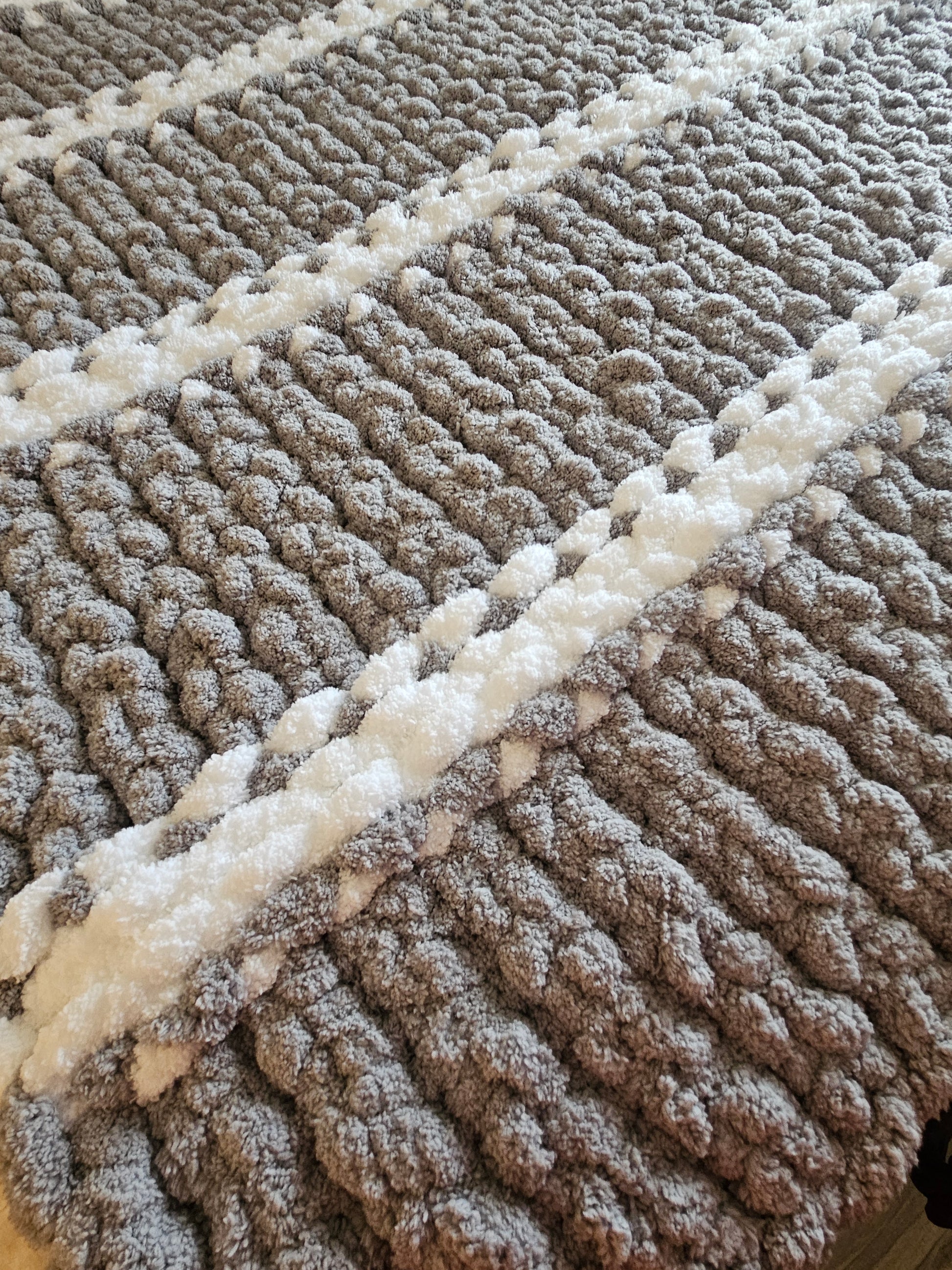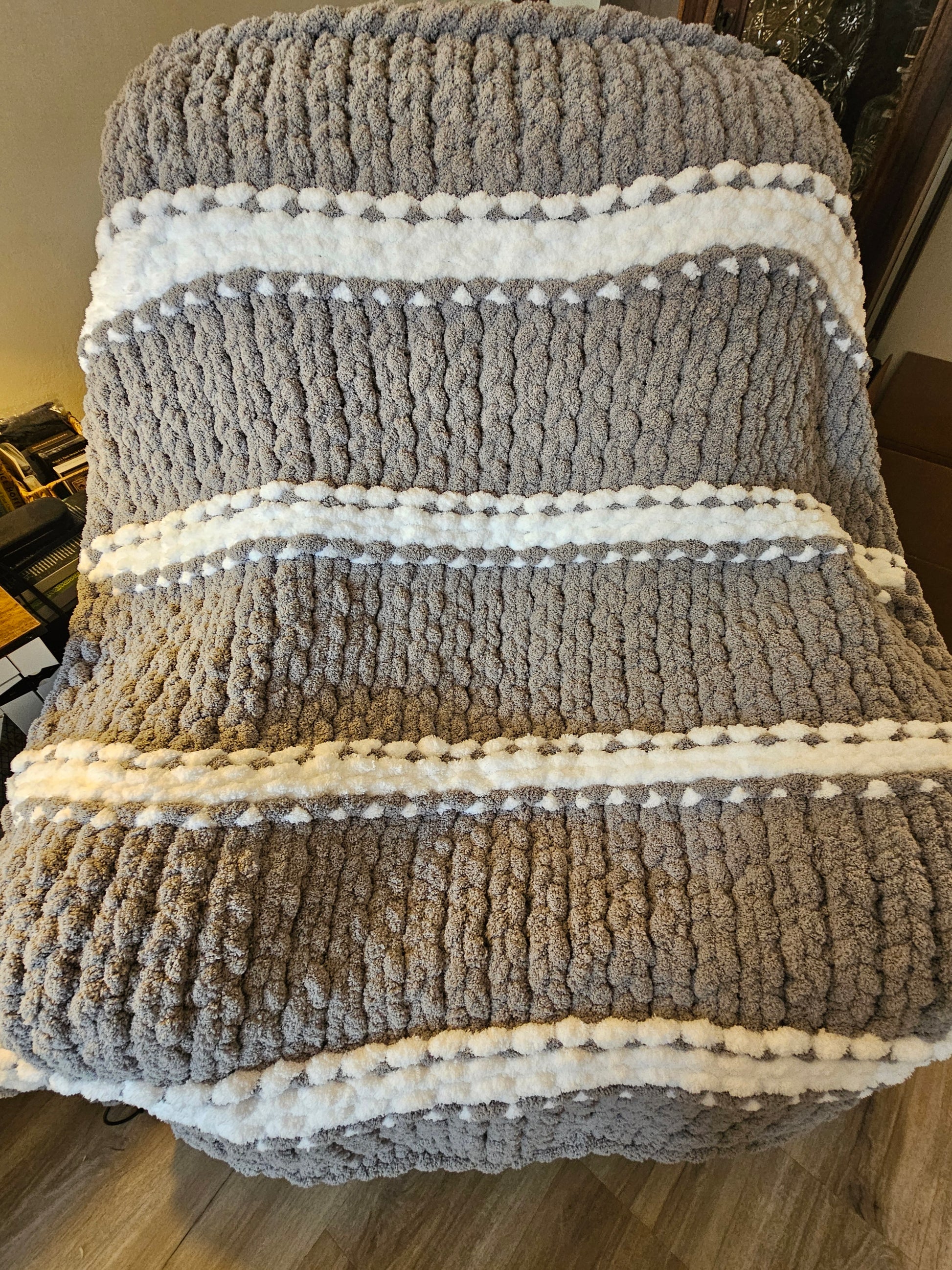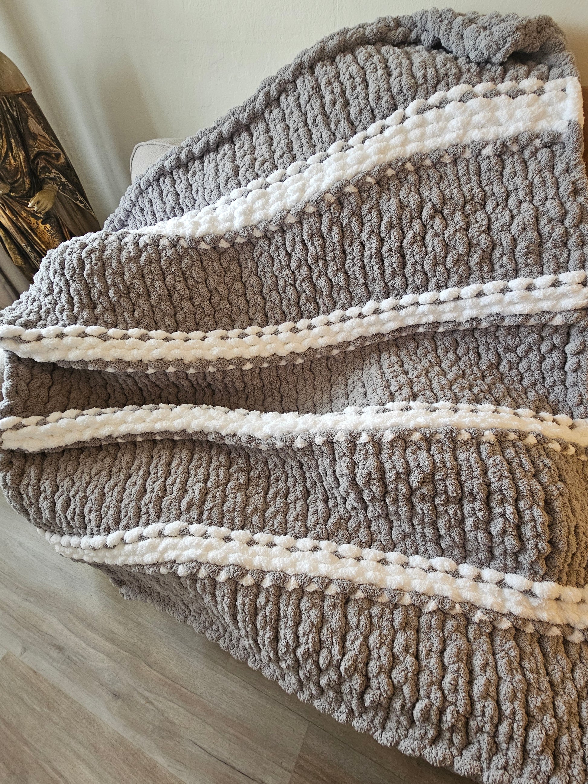 There is nothing quite like the feeling of a handcrafted blanket, and this beautiful Grey & White Chunky Chenille throw is waiting to become your new favorite "snuggle buddy."